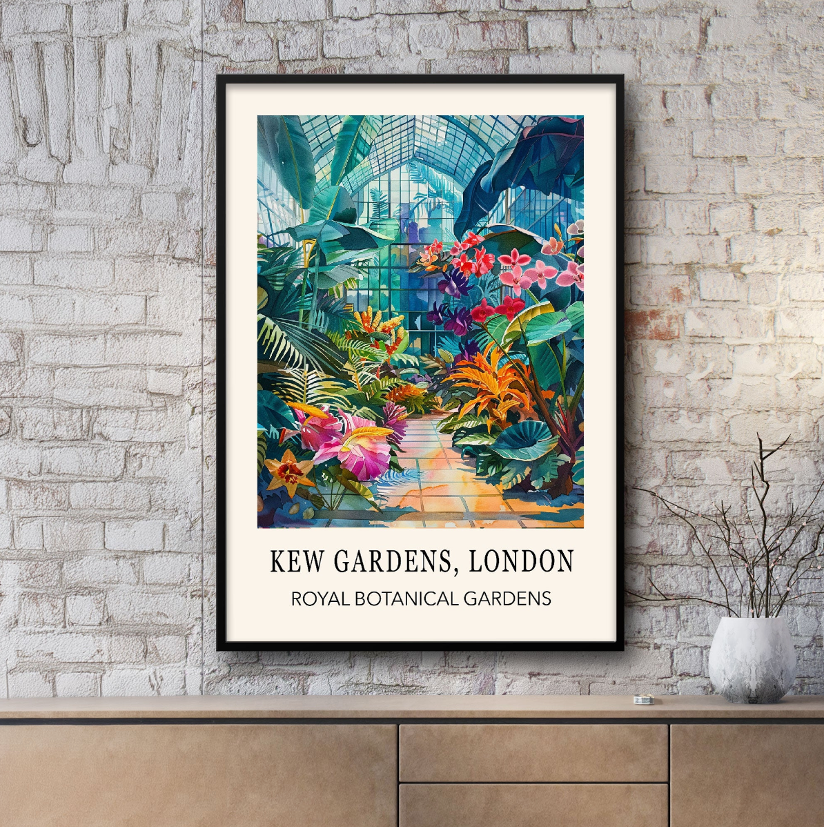 Tropical Garden Wall Art - Kew Gardens London features a glasshouse inspired by Kew Gardens, London, with greenery and greenhouse details. The artwork has vibrant flowers and plants, creating a calm and timeless botanical aesthetic.